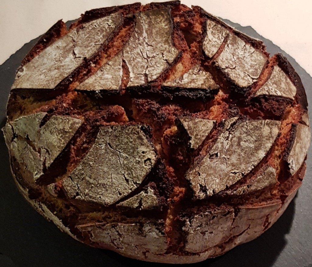3 Stunden abgedeckt bei 20°C stehen lassen und den gusseisernen Topf bei 250°C aufheizen. Das Brot in den Topf geben und bei 230°C für 30 Minuten mit Deckel und dann nochmal 25 Minuten ohne Deckel backen.