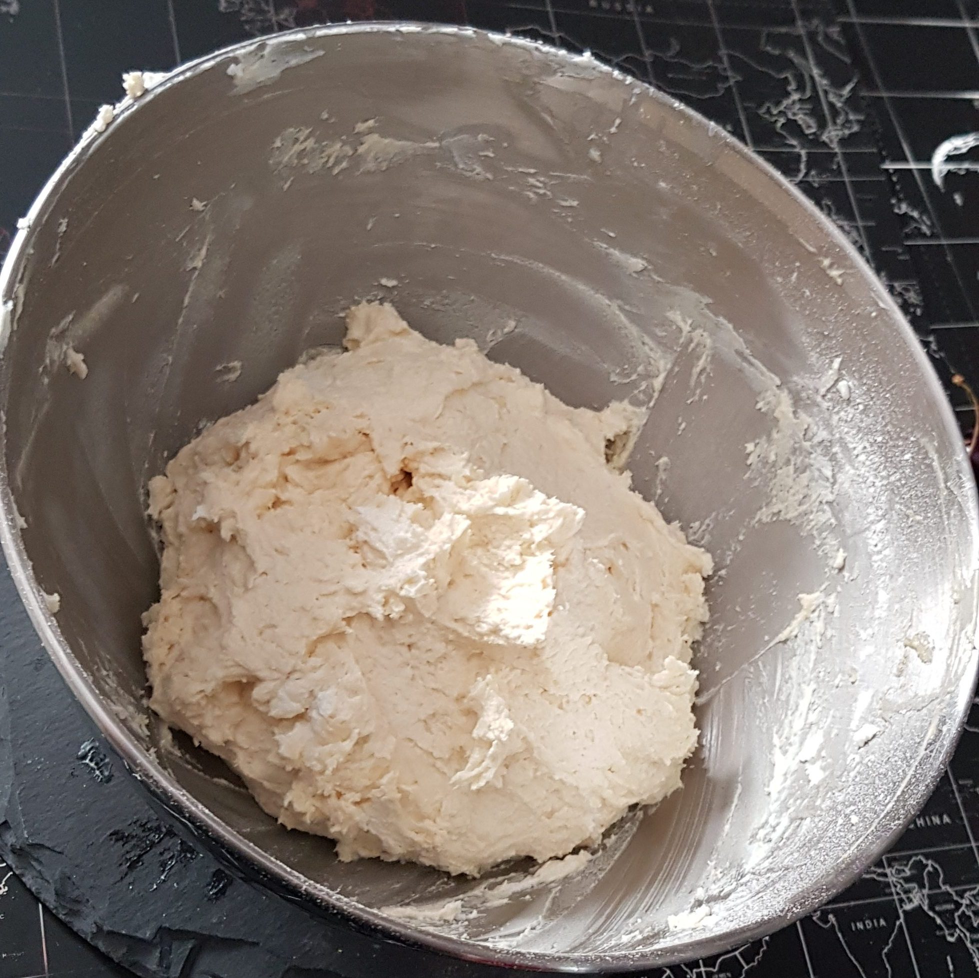 Topfen und Dinkelmehl nach und nach mit der Butter-Eiermasse vermengen und 4 Stunden kalt stellen.