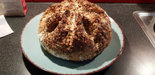 Bei 250 °C 15 Minuten mit Deckel backen und dann auf 200 °C herunter schalten und für weitere 35-45 Minuten backen.