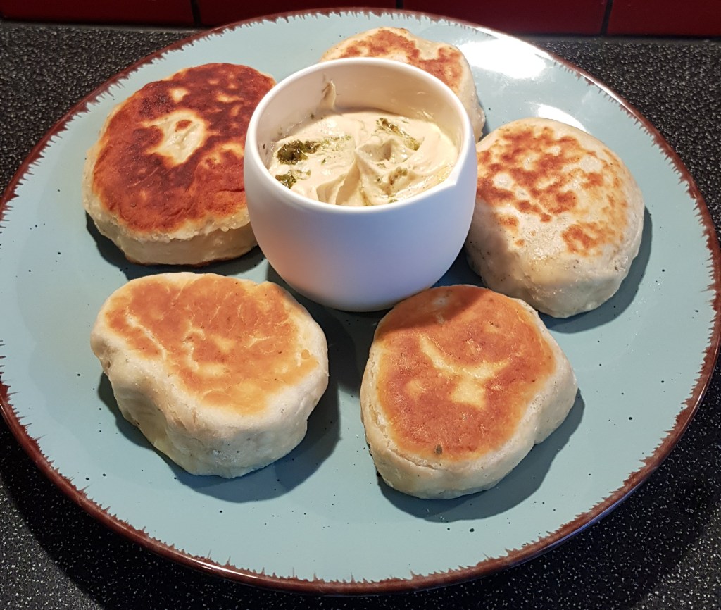Alle Zutaten miteinander vermischen, gut durchkneten und dann in 6 gleichgroße Teiglinge formen. In einer Pfanne oder auf dem Grill auf beiden Seiten gut 5 Minuten anbraten.
