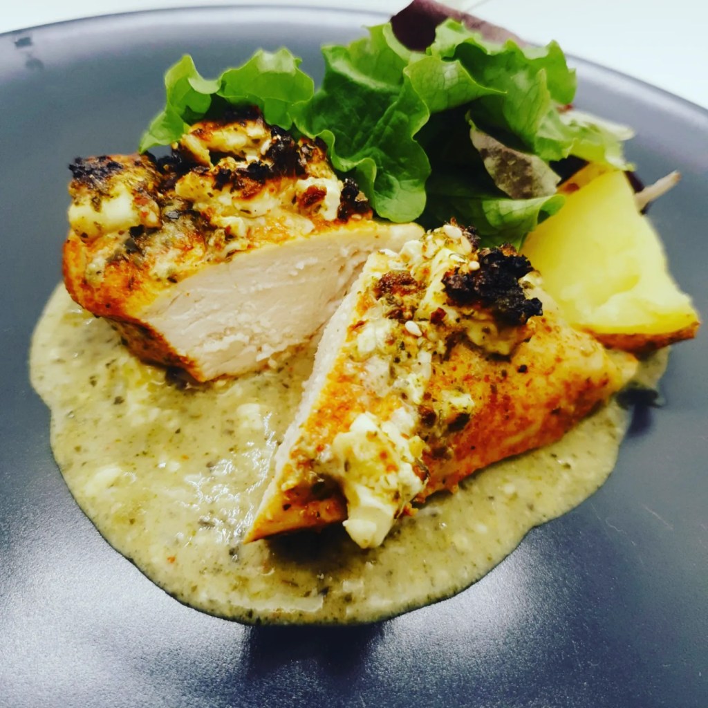 Hühnerfilet vorbereiten ( ggf. waschen, portionieren) und mit dem Hänchengewürz würzen und etwas Zitronensaft und Schale darüber träufeln und reiben.