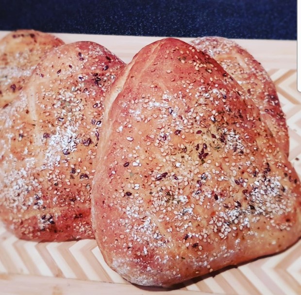 Lauwarmes Wasser mit Hefe und Zucker verrühren und 15 Minuten ruhen lassen. Mehl in eine Schüssel geben, eine Mulde in der Mitte formen, Weizensauerteig und Wasser-Hefemischung hinzufügen. Alles miteinander verrühren, mit etwas Mehl bestäuben und abgedeckt 35 Minuten gehen lassen. Danach Salz und Olivenöl hinzufügen und verkneten. Der Teig ist relativ feucht und soll auch so sein. Teig abgedeckt nochmal 35 Minuten gehen lassen. Teig nach dem Gehen lassen nochmal kurz kneten und auf einer gut bemehlten Arbeitsfläche auf 2 Portionen aufteilen. Backstein/ Pizzastein aufheizen Backofen auf 230 °C vorheizen. Jede Teigportion zu einem Fladen formen, mit einem Messer einschneiden, mit Wasser bestreichen und mit Schwarzkümmel und Sesam bestreuen. Fladen 25 Minuten backen -ich habs gern knuspriger.