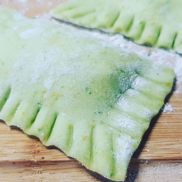 Es gibt leckeren Pastateig Curry, Spinat und ganz normalen.