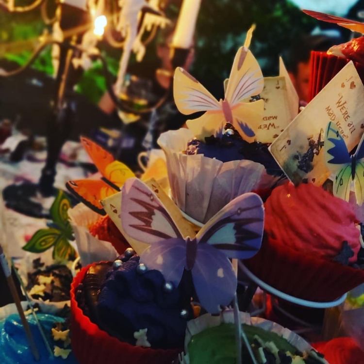 Da das Thema Alice im Wunderland war habe ich die einzelnen Muffins mit Ganache überzogen und habe eine gefärbte Topfen-Creme dressiert*** und mit essbaren Schmetterlingen garniert.